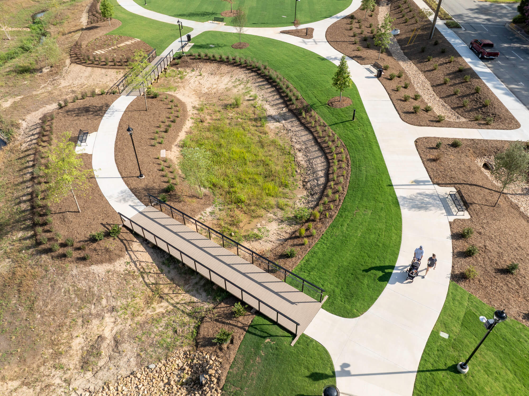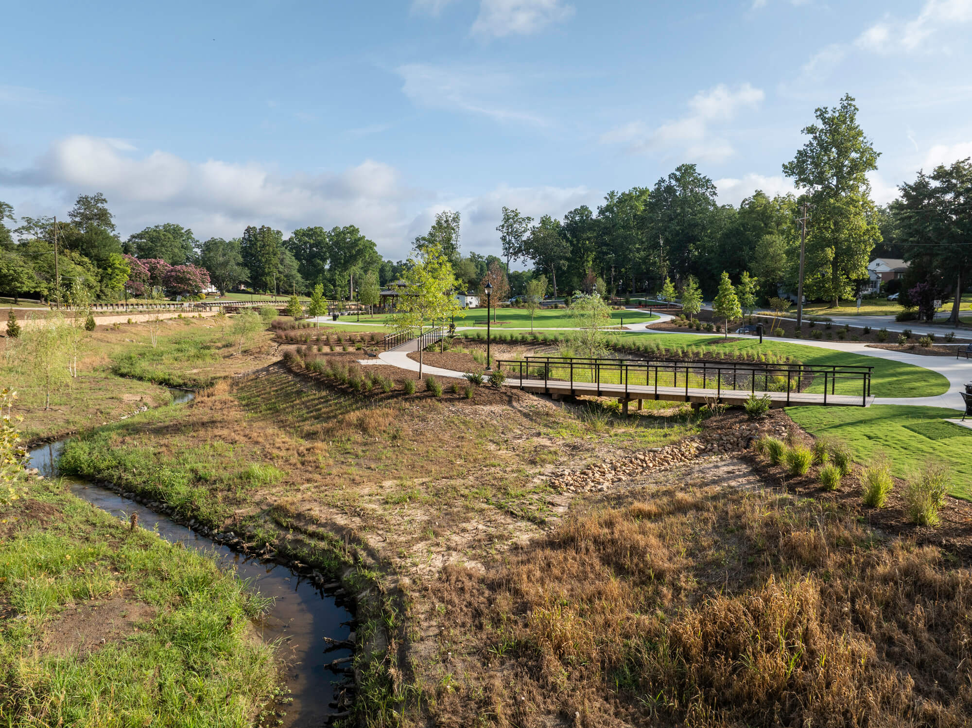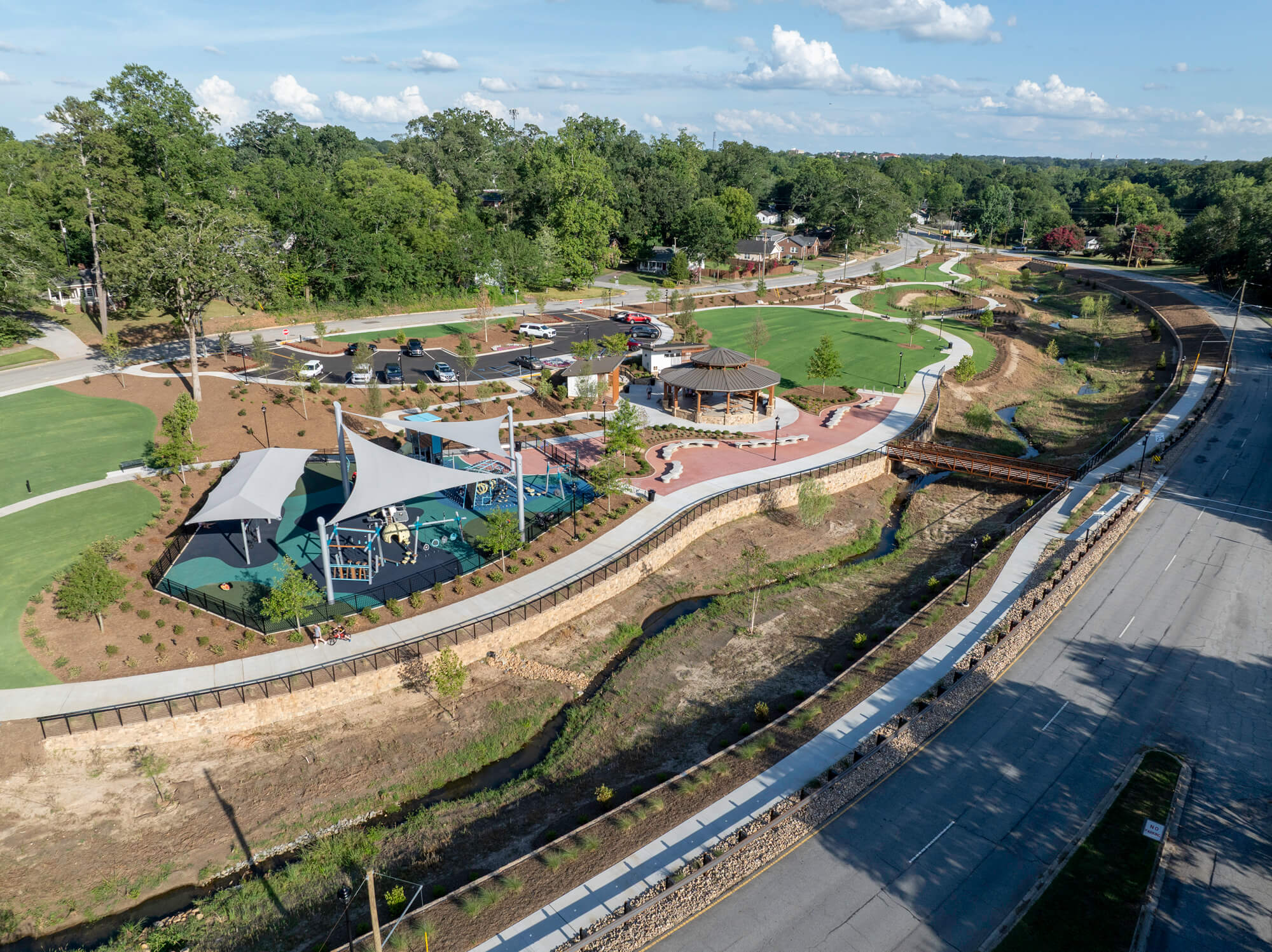 A central component of the project is the full restoration of Whitner Creek. Previously confined to a straight, concrete-lined channel that contributed to flooding during heavy rain events, the creek has been redesigned as a natural stream channel connected to its floodplain. This approach not only improves stormwater performance and reduces flood risk, but also introduces a scenic walking path and enhanced habitat – adding both function and beauty to the park experience.