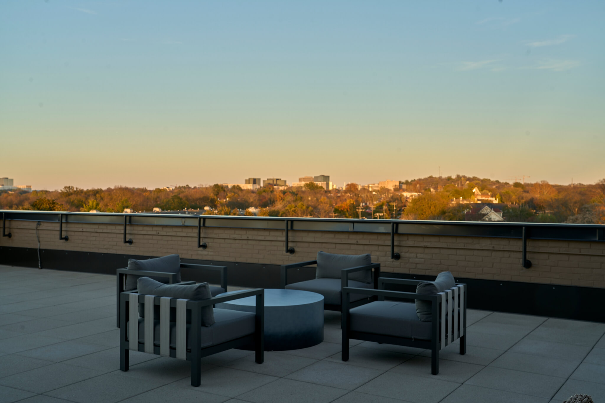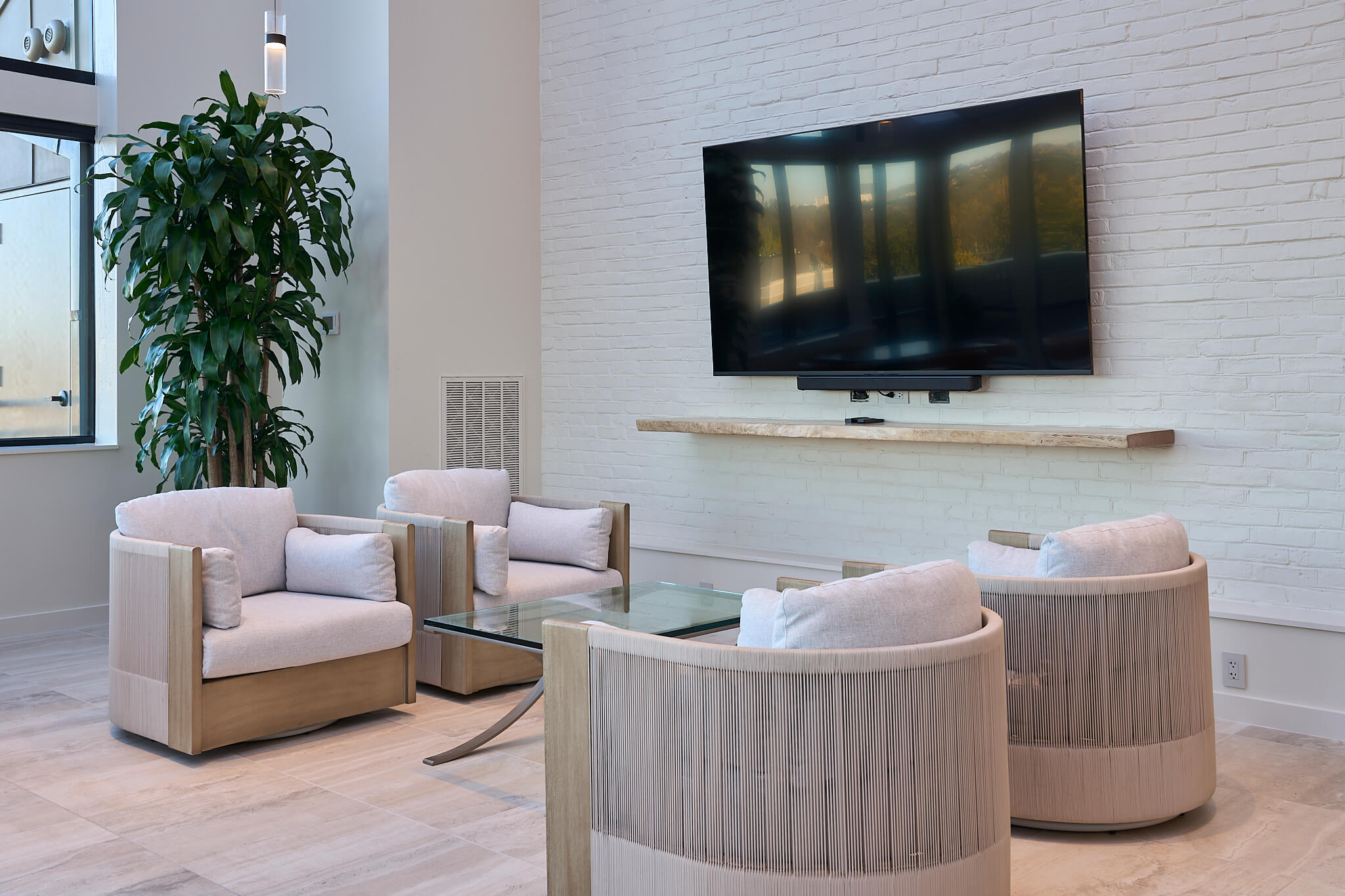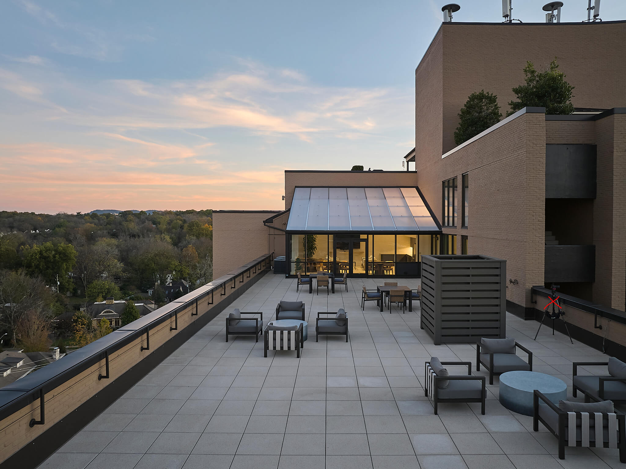 Interior common areas were updated with new finishes, furnishings and accessories to create a clean, modern aesthetic. The solarium was completely rebuilt with floor-to-ceiling glass and reconfigured for flexible gathering space. Residents can enjoy the 10th-floor sky terrace overlooking the skyline of Nashville, along with a heated pool, fitness center, refurbished guest suites and the restored Wilson Plaza green space. These thoughtful additions create a harmonious blend of comfort and luxury that enhances the living experience.