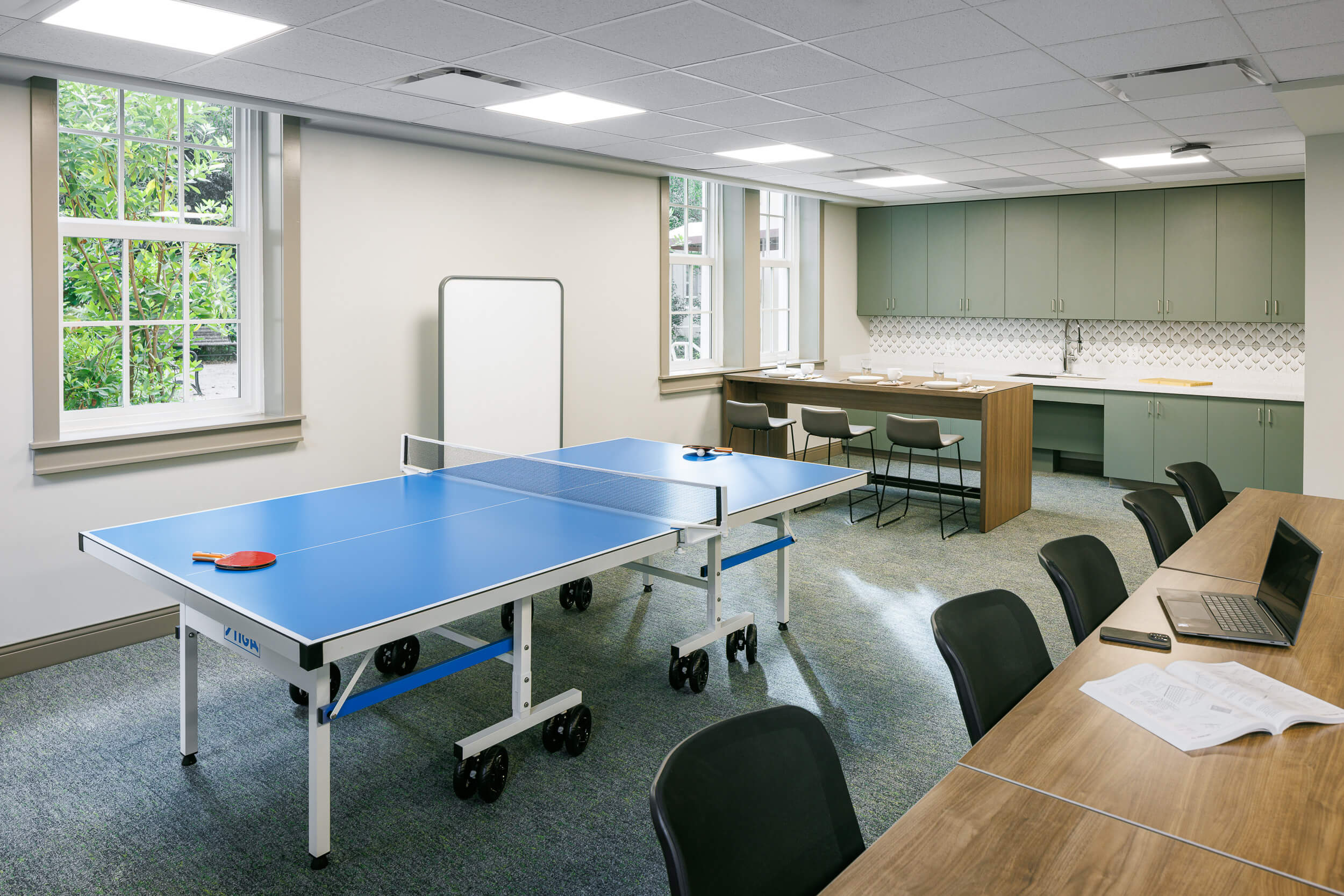 The renovation transformed the residence hall into a vibrant, modern student living environment while carefully preserving its historic character. By reconfiguring the building with efficient suite-style planning, the project increased capacity by 30% without expanding the footprint. A new entry and renovated courtyard brought fresh energy and improved functionality, all while maintaining the original façade, slate roof and architectural details that give the building its timeless appeal.