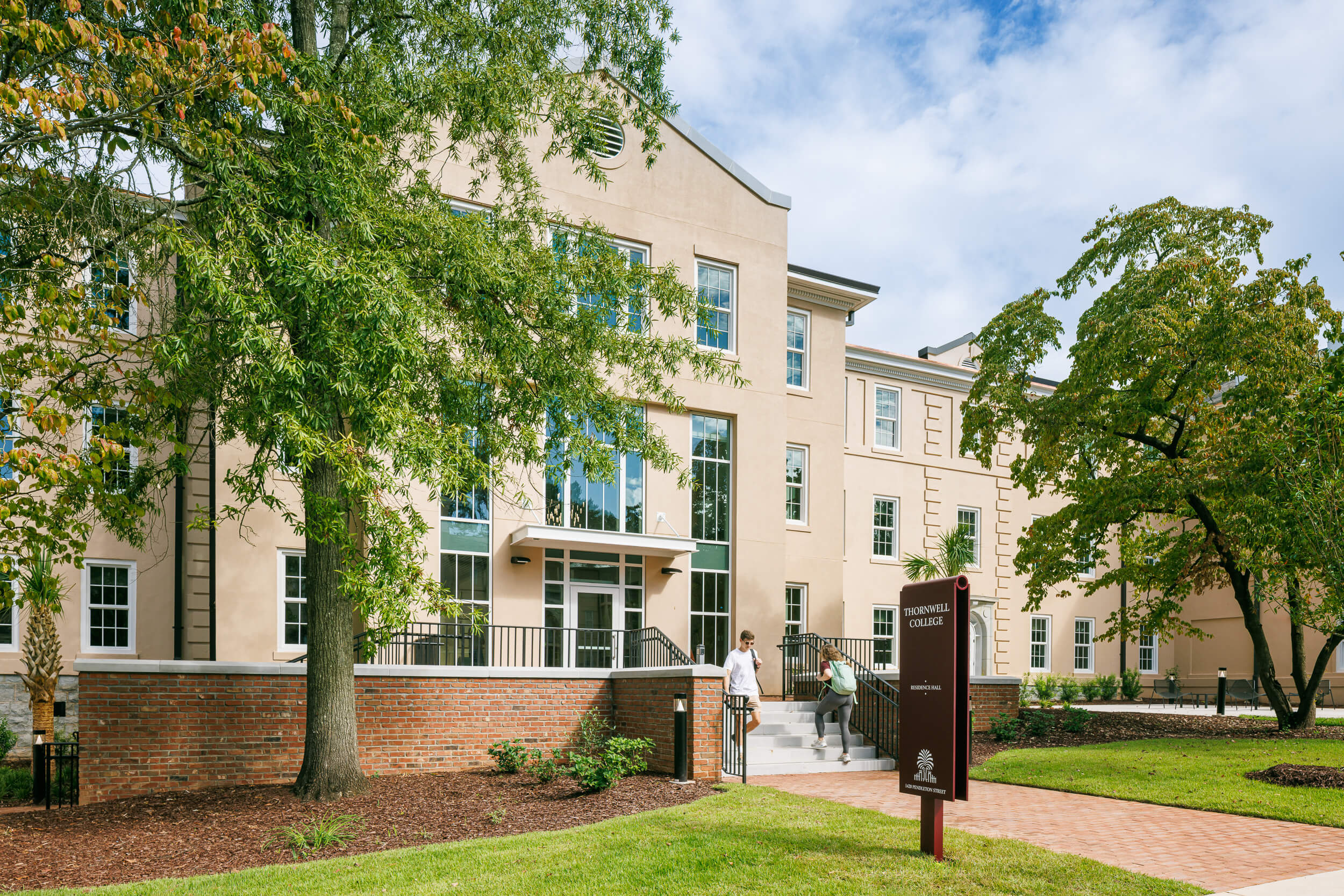 Thornwell Residence Hall at the University of South Carolina underwent a 41,000-square-foot renovation and addition, transforming the historic building into a modern student living environment. The redesigned floor plan shifts from apartment-style units to suite-style housing, increasing capacity while improving functionality and shared spaces.